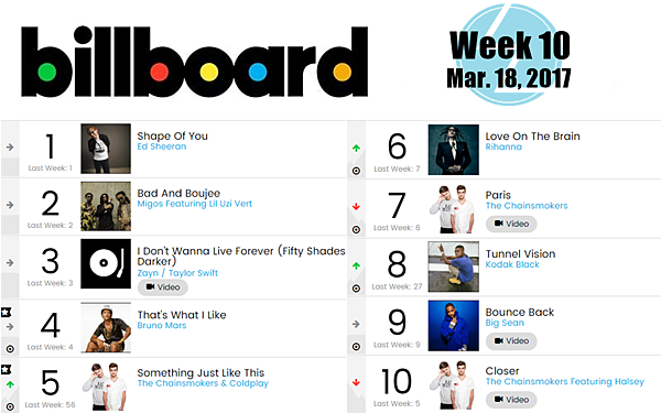 *老菸槍和冷玩合作的Something Just Like This快速上升至第5名,使他們同時有3首歌在前十,成為繼The Beatles、Bee Gees之後同時擁有3首以上的單曲在前十的團體。另外Closer打平Uptown Funk31週位於前十的紀錄